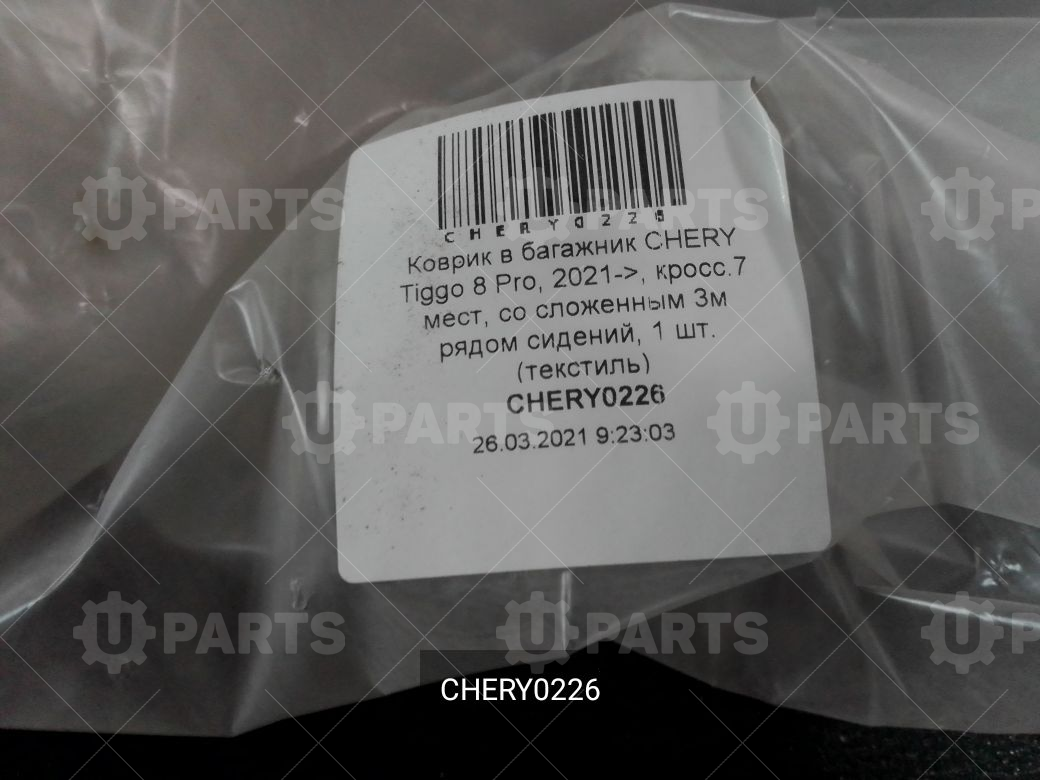 Коврик в багажник текстильный (7 мест со сложенным 3м рядом) "CHERY" для CHERY Chery, Tiggo 8 Pro, 2.0 CVT (170 л.с.), (2021 - по н.в.) 2.0 (2021 - )(Производитель: CHERY, артикул: CHERY0226) в Екатерибурге, с доставкой по России. Этот товар есть в наличии. Его можно приобрести за наличный расчет и по безналичному платежу. Карты платежных систем принимаются к оплате.